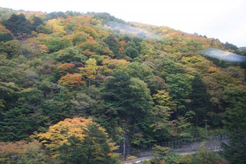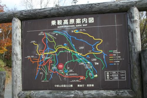 降雪で予定されていた「笹ヶ峰」への運行が取り止めになった代わりに、バスは松本から乗鞍高原へと向かいました。「奈川渡ダム」周辺の見事な紅葉を眺めながらさらに「国民休暇村」まで登って休憩です。